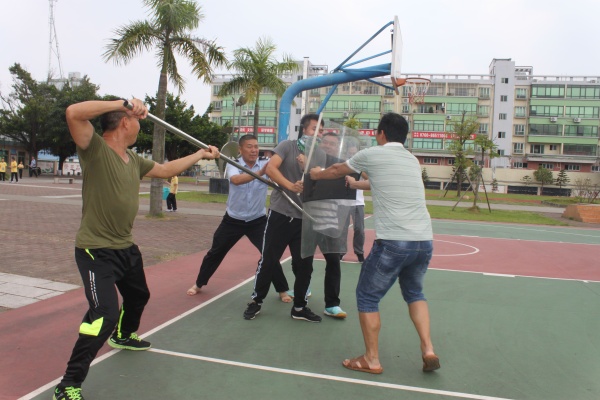 為了做好這次演練,學(xué)校安全組制定了防暴力襲擊應(yīng)急演練方案。主管安全的學(xué)校行政楊振宇主任給學(xué)校安保人員及男教師進(jìn)行校園安全應(yīng)急培訓(xùn)會(huì)。會(huì)后,部分男教師及學(xué)校安保人員扮演不同角色模擬演練。演練流程是:一名老師扮演歹徒,以到教室找班主任了解學(xué)生學(xué)習(xí)情況的名義騙過保安人員進(jìn)入了校園,突然拔刀沖入,保安人員發(fā)現(xiàn),立即出動(dòng),和學(xué)校老師手持防爆叉等工具將恐怖分子團(tuán)團(tuán)圍住,巧妙周旋,贏得援助時(shí)間。并想方設(shè)法將歹徒制服。