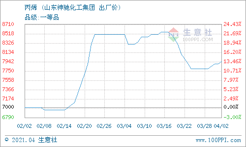 4月2日,山東神馳化工集團丙烯最新報價上調(diào),漲50元/噸至7950元/噸。
