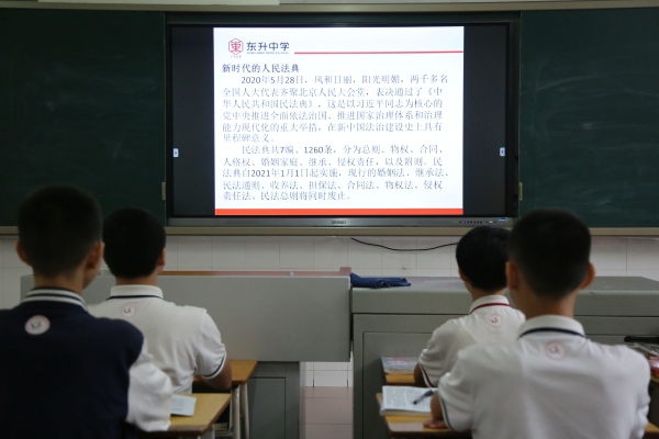 《中華人民共和國民法典》是一部社會(huì)生活百科全書,是人民民事權(quán)利的保障法典,分7編1260條,將于2021年1月1日起施行。為了讓東升中學(xué)全體師生學(xué)習(xí)了解《民法典》基本內(nèi)容,加強(qiáng)對(duì)廣大師生、特別是青少年的法制宣傳教育,7月8日上午,東升中學(xué)德育處利用校園電視臺(tái)在全校范圍內(nèi)開展了《民法典》學(xué)習(xí)宣傳活動(dòng)。該活動(dòng)由東升中學(xué)德育處黎國明副主任主講,在講座中,他還組織大家觀看《民法典宣傳片第十版》宣傳教育視頻。東升中學(xué)全體師生約有1500人參加該項(xiàng)活動(dòng)。