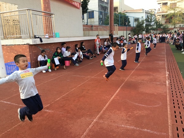 隨著拔河比賽的落下帷幕,緊接著舉行的是27日下午的跳繩比賽,跳繩比賽可謂是讓觀眾們應(yīng)接不暇的一個(gè)項(xiàng)目。每班的參賽選手們一起上場(chǎng)站成一列,裁判老師的哨聲一響,參賽的同學(xué)們同時(shí)開(kāi)始跳繩。繩子在快速轉(zhuǎn)動(dòng),啦啦隊(duì)在大聲地為本班的選手加油。一分鐘時(shí)間很快過(guò)去了,這一輪比賽結(jié)束,在這項(xiàng)持續(xù)時(shí)間短但耗體力強(qiáng)的比賽中,同學(xué)們的臉上雖然有疲累的神態(tài),但更多的是完成比賽的喜悅感,畢竟在比賽中,參與更重要!