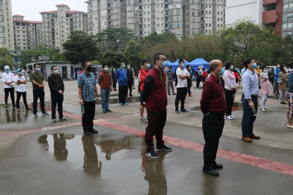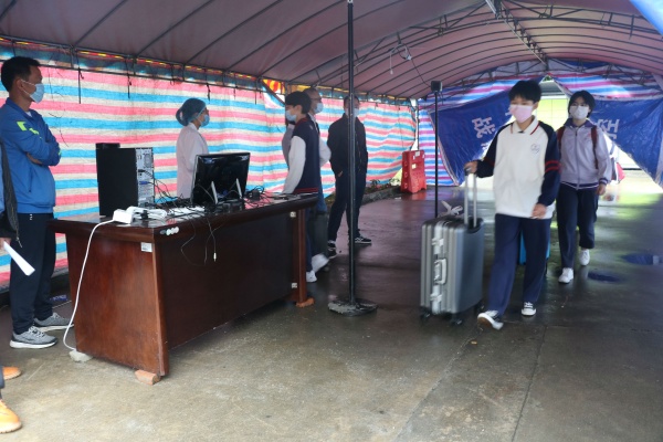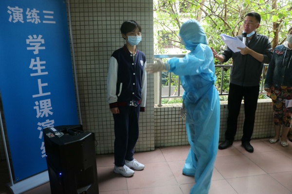28日早上9:00,所有參演人員及觀摩人員以前后1.5米間隔列隊集中。東升中學(xué)德育處副主任黎國明就演練流程和注意事項作了詳細講解。隨后,初、高中共16名學(xué)生嚴(yán)格按照入校流程、根據(jù)地面標(biāo)識保持間距、佩戴口罩依次入校。值日行政、工作人員對入校學(xué)生體溫進行嚴(yán)密監(jiān)測。如發(fā)現(xiàn)體溫異常并伴有咳嗽癥狀學(xué)生,則由身著隔離服的引領(lǐng)員帶到隔離區(qū),校醫(yī)將為其重測體溫,了解相關(guān)信息,并做好記錄。體溫恢復(fù)正常的,進入教學(xué)區(qū);體溫不正常的,向?qū)W校領(lǐng)導(dǎo)匯報。對于沒有流行病學(xué)史的人員,通過電話告知家長接回去;如果家長不能接,按要求及時送到東升醫(yī)院就醫(yī)。