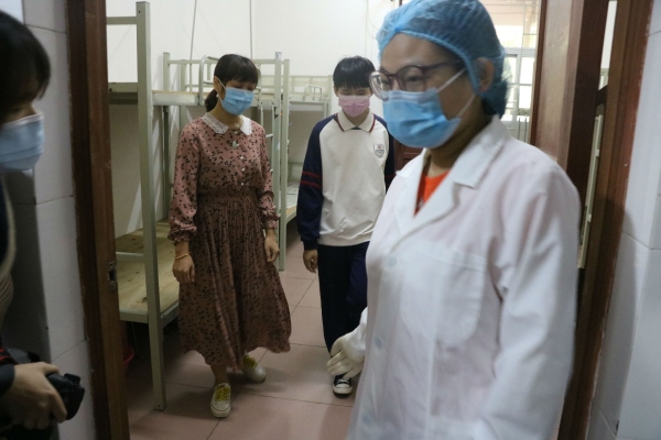 由于兩所學(xué)校的部分學(xué)生是住宿生,宿舍的檢測防控工作也十分重要。為了確保安全,兩所學(xué)校要求住宿生除了洗澡和睡覺之外,其余時間均需佩戴口罩;注重宿舍內(nèi)外的衛(wèi)生保潔工作,不得隨著意離開宿舍。每一天,宿管工作人員均對進入宿舍的學(xué)生進行體溫檢測。如果某一宿舍某個學(xué)生出現(xiàn)發(fā)熱癥狀、咳嗽或嘔吐癥狀,宿舍長將馬上報告宿舍管理員(即“宿管”)。一名宿管第一時間電話聯(lián)系校醫(yī),由校醫(yī)帶學(xué)生到臨時隔離觀察室就醫(yī),全程佩戴口罩;另一名宿管電話聯(lián)系班主任及家長,同時安撫其他學(xué)生情緒。 第二位值班校醫(yī)立即指導(dǎo)宿管人員對宿舍進行消毒工作,所產(chǎn)生的垃圾將單獨特別處理。同時,啟用備用宿舍,將同宿舍的學(xué)生帶到備用宿舍,或者疏散到戶外,待消毒后通風(fēng)30分鐘,學(xué)生再重新進入宿舍。