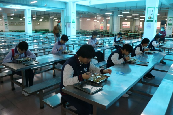 在就餐安排上,東升中學(xué)與東升高中實行錯峰分流制。上午放學(xué)后,由班主任組織本班學(xué)生到飯?zhí)镁筒?。進入食堂前,應(yīng)先至洗手池進行手部清潔,按“七步洗手法”使用洗手液、自來水徹底清潔雙手。洗手后,引導(dǎo)學(xué)生到本班指定位置間隔1.5米就坐,并由雙向四人桌改為單向兩人桌。班主任檢查督促學(xué)生按規(guī)定有序文明就餐。就餐結(jié)束后,學(xué)生依次洗手做好清潔,戴上口罩,統(tǒng)一有序從飯?zhí)煤箝T離開。