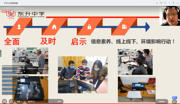 為進一步落實疫情期間“停課不停學”要求,順利推進在線課程教學,把脈問診“線上教學”中存在的問題,分享交流成功的經(jīng)驗做法,2020年3月18日下午,東升鎮(zhèn)教育事務指導中心通過釘釘網(wǎng)絡平臺召開全鎮(zhèn)線上教育交流研討視頻會議。東升鎮(zhèn)教育事務指導中心張宏齊主任、各教研員、全鎮(zhèn)四所中學的校長和全體行政均參加了會議。會議由東升中學教導處唐紅波主任主持,東升鎮(zhèn)教育事務指導中心張宏齊主任作總結(jié)講話。