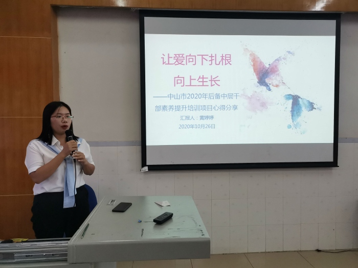 為夯實中山市中小幼學(xué)校后備中層干部人才,提高干部隊伍整體素質(zhì),來自中山市各中小幼學(xué)校的30位教師前往華南師范大學(xué)參加為期6天的中山市2020年后備中層干部素養(yǎng)提升培訓(xùn)項目。10月26日下午,中山市阜沙鎮(zhèn)豐聯(lián)小學(xué)黃婷婷主任與全體教師分享了在中山市2020年后備中層干部素養(yǎng)提升培訓(xùn)項目中的心得體會,共同交流討論教育工作者應(yīng)如何實現(xiàn)職業(yè)理想與幸福。
