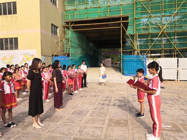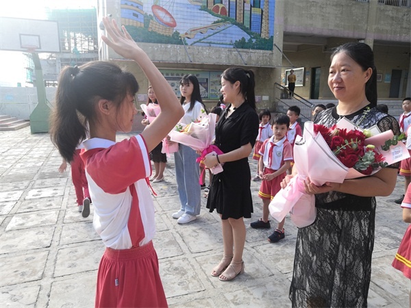 隨后,學(xué)校利用早讀時(shí)間舉行了簡(jiǎn)單的慶?;顒?dòng)?;顒?dòng)伊始,學(xué)生們認(rèn)真聆聽蘇少麗校長(zhǎng)講話,蘇校長(zhǎng)號(hào)召全體同學(xué),用喜歡的方式向自己的教師表達(dá)祝福。隨后,五年級(jí)(2)班的蘇翠兒同學(xué)和吳俊銘同學(xué)帶來了詩朗誦《老師,我想對(duì)您說》,字字深情,輕柔舒緩,抒發(fā)了對(duì)教師們的感激之情。朗誦結(jié)束后,廣播響起了音樂,少先隊(duì)員代表們來到每位教師跟前送上鮮花和祝福。教師們手捧鮮花,臉上洋溢著幸福的微笑。其余學(xué)生也都紛紛送上了發(fā)自內(nèi)心的祝福。一張張精美的自制賀卡,一份份漂亮的手工作品,都傾注了學(xué)生們對(duì)教師的愛。