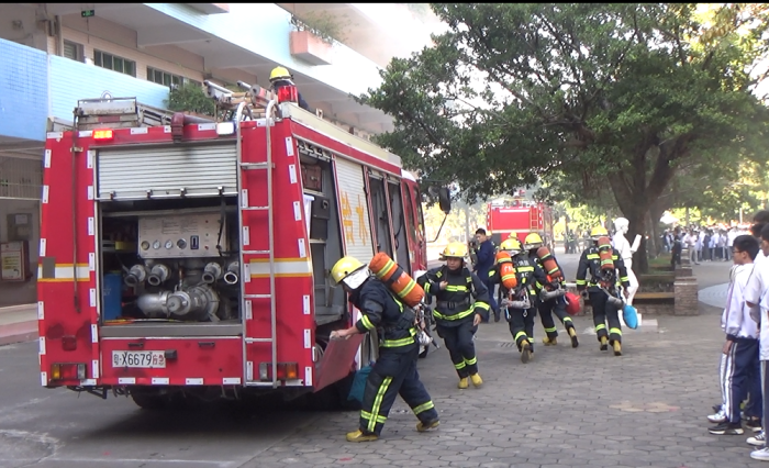 上午9時15分,煙幕彈突然爆炸,煙霧彌漫整個校園,緊急刺耳的警報聲立即響起,全體師生和教職員工迅速按照設(shè)定的逃生路線撤離課室。學生們個個嚴肅緊張,向緊急疏散場所——中心廣場集結(jié)。各樓梯口負責引導的老師,按照消防演練方案疏散學生,保證樓內(nèi)每個學生迅速有序“逃生”,以免在慌亂中出現(xiàn)踩踏以及滯留課室的情況。緊接著兩臺消防車呼嘯而來,快速到達“火災”現(xiàn)場。消防人員快速穿好裝備,帶上救援設(shè)備,冒著滾滾白煙,沖進“火場”進行緊急施救。班主任快速清點并上報各班人數(shù)。整個疏散演練過程從報警到撤離到安全地帶,按規(guī)定時間完成了疏散演練。