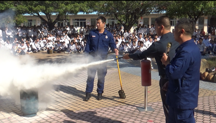 隨后劉啟堂指導員手把手地指導教職員工、學生進行滅火實操演練。管德豐校長、賴其森主任、教師、廚師、保安、教官和學生代表,紛紛拿起滅火器,對著熊熊烈火噴射干粉,火立即被撲滅,然后迅速擰緊煤氣罐。廣大教職員工、學生實操演練熱情高漲,在實操中,感受到火勢的兇猛和滅火器的威力,滅火的正確姿勢,從而提高了火災處理應(yīng)變能力。