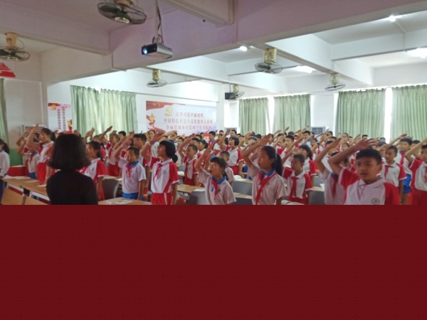 為弘揚(yáng)愛(ài)國(guó)主義精神,增強(qiáng)師生的國(guó)家、民族自豪感和向心力,2019年9月16日下午,大豐小學(xué)校黨委書(shū)記、校長(zhǎng)蘇少麗在學(xué)校三樓多媒體教室為五、六年級(jí)學(xué)生講授思想政治理論課第一課。五六年級(jí)全體學(xué)生及部分教師到場(chǎng)聆聽(tīng)。