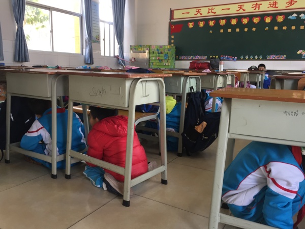 首先模擬的是地震發(fā)生時的情景。當(dāng)天上午大課間,第一聲急促刺耳的警報聲響起……學(xué)生在老師的指導(dǎo)下雙手抱頭或用書本保護頭部,將身體蜷縮,迅速躲在桌子下、柜子或墻角等牢固的三角空間。隨后模擬火災(zāi)發(fā)生時的情形。隨著第二次警報聲的響起,各位老師立即到達指定崗位,各樓層負責(zé)老師迅速站在教學(xué)樓各個轉(zhuǎn)角處,引導(dǎo)樓內(nèi)學(xué)生快速疏散,維護樓道安全。各班任課老師帶領(lǐng)學(xué)生彎著腰,用手帕、毛巾、手等捂住口鼻,按照指定的疏散路線,快速,有序,安全地疏散到教學(xué)樓前操場的安全地帶。整個疏散過程中,各樓層各班級都做到了井然有序,無人員遺漏,無傷情出現(xiàn)。