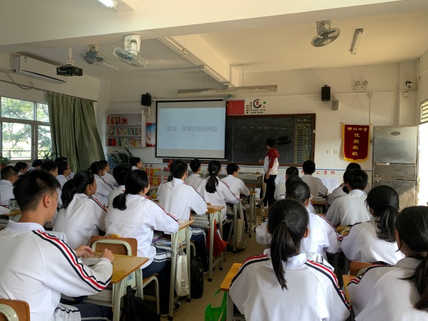 第一節(jié)課由初二數(shù)學(xué)備課組的楊依蘭老師執(zhí)教“全等三角形的判定”。本節(jié)課楊依蘭老師通過一個(gè)例題,鼓勵(lì)學(xué)生從不同方法入手證明兩個(gè)三角形的全等。學(xué)生在活動(dòng)過程中既有獨(dú)立思考,也有小組合作討論。討論結(jié)束之后,再由個(gè)人或者小組上臺(tái)口頭展示解題過程,圍繞著口頭展示的三個(gè)標(biāo)準(zhǔn)----準(zhǔn)確度、流暢度和邏輯來評價(jià)學(xué)生,不僅培養(yǎng)了學(xué)生邏輯思維能力還鍛煉了他們的口頭表達(dá)能力。
