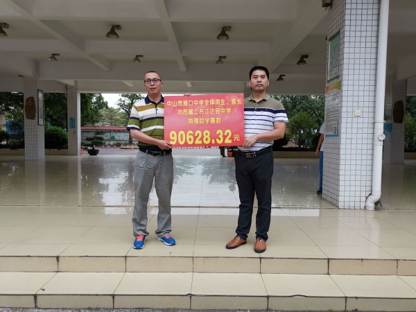 10月28日早上,港口中學(xué)升旗儀式結(jié)束后,舉行了向西藏工布江達(dá)縣中學(xué)捐贈(zèng)助學(xué)善款的儀式。德育處張建榮副主任宣讀各班師生和家長(zhǎng)的捐贈(zèng)金額,并代表港口中學(xué)和工布江達(dá)縣中學(xué)感謝全體師生和家長(zhǎng)的愛心善舉。港口中學(xué)管德豐校長(zhǎng)把籌得的全部善款90628.32元交給了援藏支教的范泰昭副校長(zhǎng),讓范泰昭副校長(zhǎng)把港口中學(xué)全體師生和家長(zhǎng)的愛心善款帶到工布江達(dá)縣中學(xué),讓愛的陽(yáng)光溫暖格?;ㄒ粯拥奈鞑睾⒆印7短┱迅毙iL(zhǎng)發(fā)表感言:感謝學(xué)校向中山市對(duì)口扶貧市靈芝市伸出援手,在教育方面開展扶貧攻尖。并叮囑港中學(xué)子:珍惜美好的生活和學(xué)習(xí)環(huán)境,在學(xué)習(xí)上取得更大的進(jìn)步。