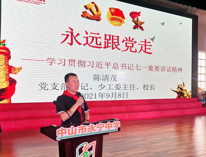 第三議程,由永寧中學(xué)少工委主任陳清茂校長作少先隊開學(xué)第一課《永遠跟黨走》。陳校長從興國、富國、強國三個時期講述了中國共產(chǎn)黨在實現(xiàn)中華民族偉大復(fù)興進程中取得的偉大成就;總結(jié)了實現(xiàn)中華民族偉大復(fù)興必須堅持的成功經(jīng)驗,解讀中國共產(chǎn)黨的成功密碼;他激勵少先隊員們在新時代,要牢記殷切希望,勇?lián)鷼v史使命,立志做一個有理想、有志向、有追求、有責(zé)任感、有奉獻精神的接班人。
