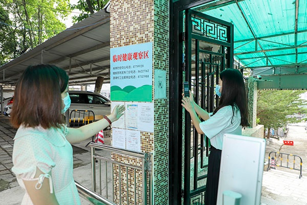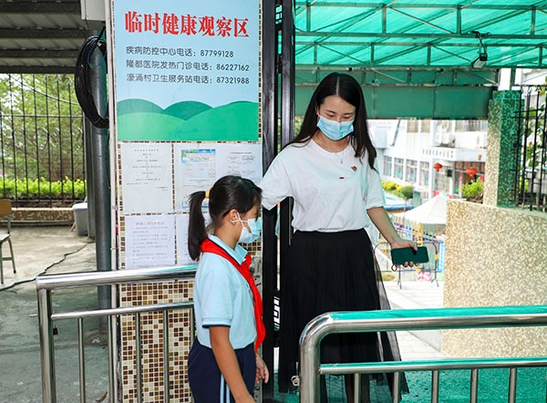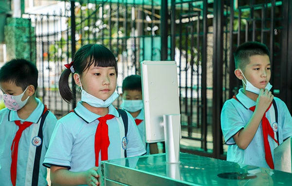 在入校情景演練中,學(xué)生按照學(xué)校規(guī)定的時(shí)間錯(cuò)峰回校,進(jìn)校門(mén)按要求前后間隔一米,刷臉測(cè)溫合格后有序進(jìn)入教學(xué)樓。