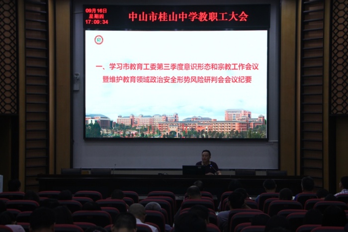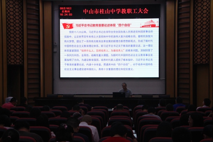 為持續(xù)深入學(xué)習(xí)領(lǐng)會(huì)習(xí)近平總書(shū)記“七一”重要講話精神,9月16日下午,桂山中學(xué)在德馨樓一樓報(bào)告廳開(kāi)展主題黨課學(xué)習(xí)。主題黨課的主要學(xué)習(xí)內(nèi)容是習(xí)近平總書(shū)記“四個(gè)自信”和“七一”重要講話精神中蘊(yùn)含的“中國(guó)之治”與“中國(guó)之智”。主題黨課由學(xué)校黨委委員劉云平同志主持。