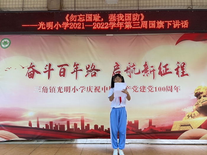為紀(jì)念“九一八”事變90周年,進(jìn)一步弘揚(yáng)愛國主義精神,增強(qiáng)全體師生的國防觀念,9月18日上午,三角鎮(zhèn)光明小學(xué)組織全體師生開展紀(jì)念“九一八”主題教育活動(dòng)?! ?/p>