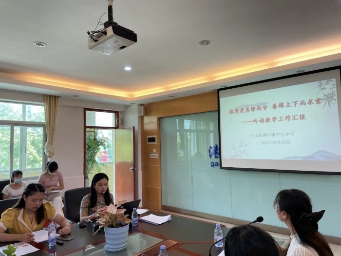 活動(dòng)第二個(gè)議程由課題組成員楊秋云老師圍繞著中心小學(xué)是怎樣將吟誦融入現(xiàn)在的語文教學(xué)中做分享講話。楊老師通過圖片、活動(dòng)和視頻等方式呈現(xiàn)出吟誦活動(dòng)在中心小學(xué)的蓬勃發(fā)展勢頭。
