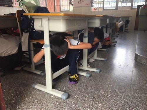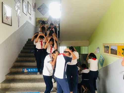 本次演練包括應(yīng)急避震與逃離疏散兩個環(huán)節(jié)。警報聲響起,同學們在老師的指導(dǎo)下,用手護住頭部,就近或蹲或躲在課桌下,以避開地震開始的強烈震動。當震撼強度減弱,警報聲再次響起時,各班學生在班主任的組織下,有序從教室逃生,緊張而不慌亂。負責樓梯口疏導(dǎo)的老師堅守在自己的工作崗位上,直到最后一名學生通過,才迅速撤離。