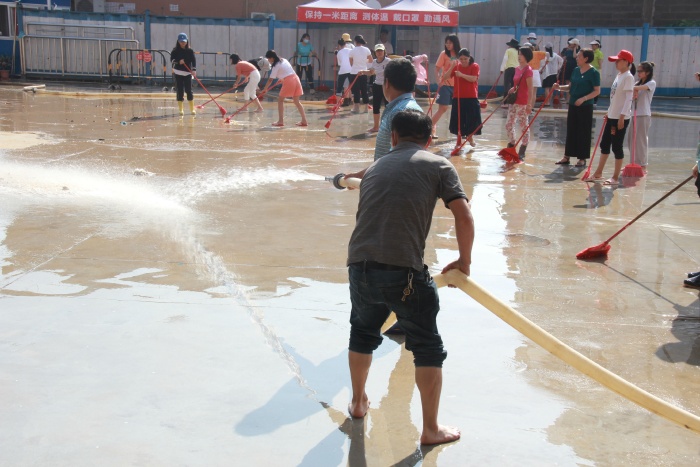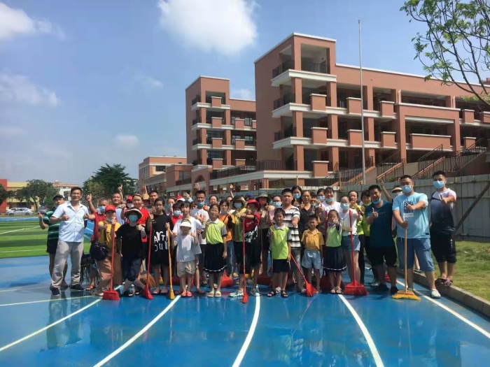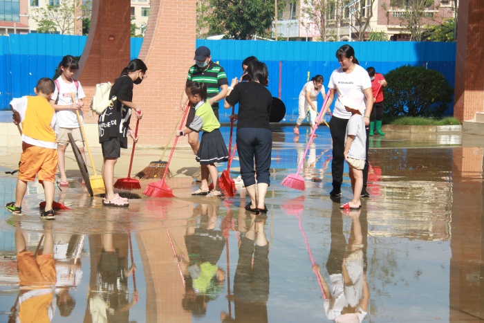 10日上午八點(diǎn),家長義工們紛紛主動(dòng)前來學(xué)校參加災(zāi)后清理工作。家長義工們根據(jù)明確分工,頭頂烈陽,腳踩淤泥,拿起工具,積極投入災(zāi)后校園清潔消殺工作中。大家分工合作,你掃我搬,你抬我拉……校門口、操場、廣場哪里有淤泥,哪里就有忙碌的身影。家長義工們,成為了校園里一道美麗的風(fēng)景線。