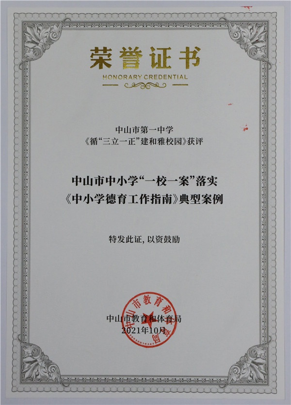 為全面貫徹黨的教育方針,落實(shí)立德樹人根本任務(wù),進(jìn)一步加強(qiáng)和改進(jìn)中小學(xué)德育工作,今年上半年,中山市教育和體育局組織開展了中山市中小學(xué)“一校一案”落實(shí)《中小學(xué)德育工作指南》典型案例評(píng)選活動(dòng)。經(jīng)專家評(píng)審,中山市一中德育工作案例《循“三立一正” 建和雅校園》被確定為首批典型案例,成為市直屬中學(xué)中唯一入選的案例。