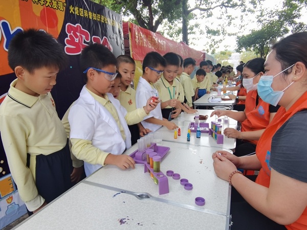 當(dāng)日下午,開發(fā)區(qū)第三小學(xué)的“鳳凰臺(tái)”熱鬧非凡,工作人員為學(xué)生設(shè)置了6個(gè)不同的小實(shí)驗(yàn)體驗(yàn)區(qū)讓學(xué)生通過實(shí)踐更清晰地了解實(shí)驗(yàn)原理的同時(shí)了解科學(xué)的魅力。在工作人員的引導(dǎo)下,學(xué)生們樂于動(dòng)手實(shí)驗(yàn),儼然是一個(gè)個(gè)小科學(xué)家,讓學(xué)生近距離地感受了科學(xué)的神奇魅力。