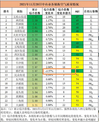 日前,中山市生態(tài)環(huán)境局公布了全市各鎮(zhèn)街空氣質(zhì)量最新情況。記者發(fā)現(xiàn),截至11月20日,中山橫欄鎮(zhèn)空氣質(zhì)量綜合指數(shù)變化率排名全市第一,是今年中山首個(gè)空氣質(zhì)量實(shí)現(xiàn)正改善的鎮(zhèn)街。