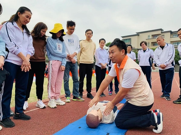 接下來,學校邀請廣東伍玖伍安全文化科技有限公司培訓人員進行應急救護培訓活動,培訓志愿者們邊講解邊指導學生體驗了消防帳篷、逃生防毒面具試戴、模擬觸電、滅火器使用等場景。在這種互動式體驗活動中,學生們興致盎然,參與度高。學生們既獲得了安全知識教育,又獲得了應急操作經(jīng)驗。培訓志愿者對老師們進行了心肺復蘇、人工呼吸、海姆立克法的培訓,通俗易懂的講解,很快教會了老師們掌握不少急救的技巧和規(guī)范性的操作。