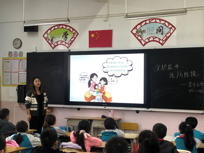 班會課上,老師借助多媒體輔助解說,與學(xué)生充分互動交流,從“教孩子們認(rèn)識隱私部位”“教孩子們識別實(shí)施性侵害的伎倆”等,給學(xué)生上了一堂保護(hù)未成年人的性教育課程,讓學(xué)生建立了“隱私”的概念,學(xué)會如何保護(hù)自己和尊重別人的隱私部位等知識。接著,課堂引入小游戲“身體紅綠燈”教孩子們?nèi)绾伪鎰e壞人、保護(hù)自己,當(dāng)面臨正在實(shí)施的性侵害如何處理、遭遇性侵害后如何尋求幫助等問題展開學(xué)習(xí),讓孩子們提高警惕,增強(qiáng)防范意識。