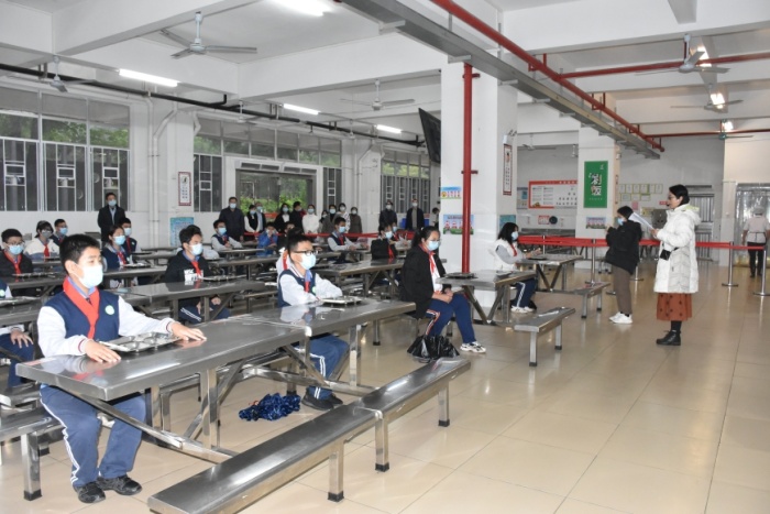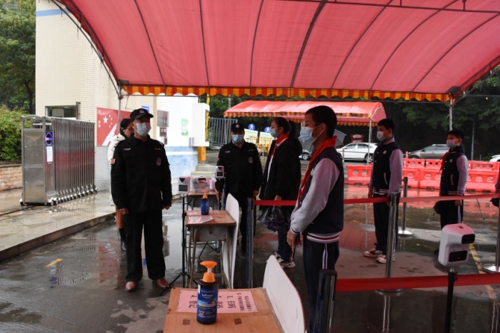 參加演練的學(xué)生首先在學(xué)校正門緩沖區(qū)排隊等待返校健康篩查,負責(zé)測溫的相關(guān)人員有序為每一位學(xué)生檢測體溫,對體溫異常的學(xué)生及時安排復(fù)查。學(xué)生順利入校后,接著進行了教師入校、外來人員入校兩個情況的演練。隨后,參加演練的全體人員來到學(xué)生飯?zhí)眠M行學(xué)生就餐演練,從排隊測溫、洗手、取餐、用餐到用餐完畢,每一個環(huán)節(jié)都有序而規(guī)范?!敖淌彝话l(fā)異常情況”的演練中,參加演練的師生按照預(yù)設(shè)的流程完成了對突發(fā)情況的處理,從詢問、判斷、疏散隔離、醫(yī)務(wù)人員介入、跟蹤處置到應(yīng)急預(yù)案啟動,整個過程緊張而有序。