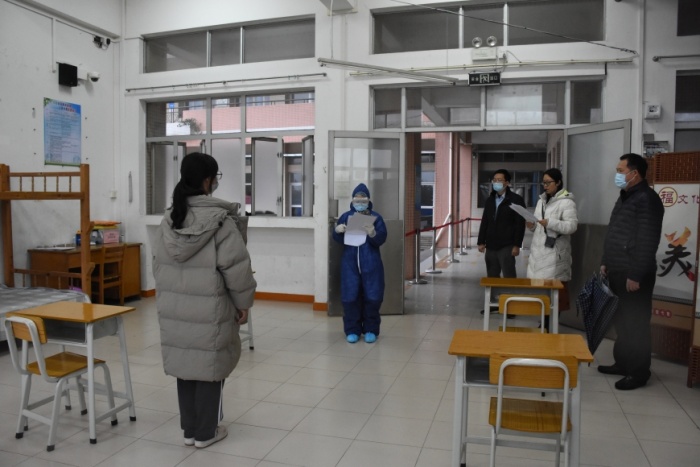 本次演練共預(yù)設(shè)了“返校入校管理”“學(xué)生就餐”“教室突發(fā)異常情況”“隔離室復(fù)查、轉(zhuǎn)運及跟蹤處置”“學(xué)校疫情防控領(lǐng)導(dǎo)小組啟動應(yīng)急預(yù)案”等場景,通過現(xiàn)場情景演示,結(jié)合旁白解說的方式,將校園疫情防控工作的每一個關(guān)鍵節(jié)點形象真實地演練出來。下午4點,2021年疫情防控應(yīng)急演練正式開始,演練按照預(yù)設(shè)流程依次進行。其中,“返校入校管理”在學(xué)校正門口進行,“學(xué)生就餐”在學(xué)校飯?zhí)眠M行,“教室突發(fā)異常情況”在教室進行,“隔離室復(fù)查、轉(zhuǎn)運及跟蹤處置”在校醫(yī)室進行。