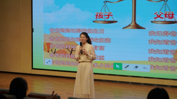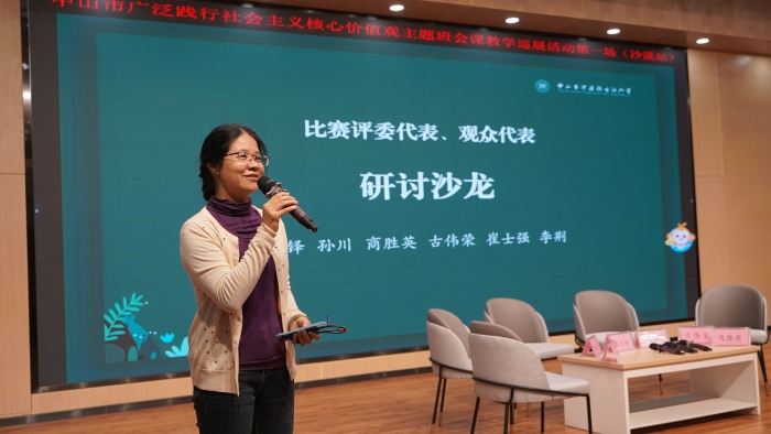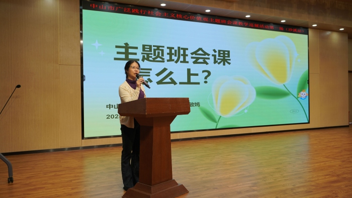 中山市教育教學(xué)研究院德育教研員朱敏嫣老師以《主題班會課怎么上》為題,就現(xiàn)時主題班會課的教學(xué)現(xiàn)狀提出了相關(guān)建議,她圍繞主題班會課目標(biāo)中的“知、信、行”三個字,以沙溪鎮(zhèn)康樂小學(xué)梁鈺婷老師的一節(jié)班會課《孝敬父母,學(xué)會感恩》為例,強調(diào)如何優(yōu)化主題班會的授課內(nèi)容與方式,使學(xué)生更好地吸收社會主義核心價值觀的營養(yǎng)。朱老師娓娓道來,使與會人員更清晰、更準(zhǔn)確地掌握社會主義核心價值觀主題班會課的教學(xué)意義、規(guī)范、策略。