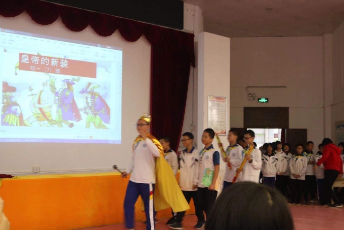 初一五班為同學們帶來的是語文短劇《狼》。原本是一個小短劇,通過同學們的二次創(chuàng)作,加入了狼吃人、眾人懸賞的的情節(jié),讓這部短劇的情節(jié)更加的豐富,人物形象更加豐滿,一五班的用心演繹獲得了陣陣掌聲和喝彩。初一六班演出的是英語劇目《狐假虎威》。同學們的口語準確流暢,背景音樂和圖片與節(jié)目環(huán)環(huán)相扣,契合主題,關鍵語句還有字幕提示,讓觀眾們身歷其境仿佛進入到了動物的世界。初一四班帶來的是原創(chuàng)作品《博雅新聞》。同學們從自身的校園生活入手,在學習生活中采集素材融入劇本,講述了他們一天學習生活中的苦與樂。這種感同身受的情節(jié)引得觀眾們不由得會心一笑,把最熱烈的掌聲送給初一四班。初一二班的節(jié)目是可愛又機智的《小紅帽》,。小紅帽機智又勇敢,還有班主任佳寧老師扮演的老爺爺,老爺爺因為老眼昏花成功的成了大灰狼的幫兇。初一七班的《皇帝的新裝》里,可愛的朱嘉琪老師扮演一個被皇帝新裝帥暈的姑娘,成功逗得學生們哈哈大笑。還有《幸福是什么》《若一切只如初見》等節(jié)目。