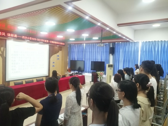 “我是一名光榮的人民教師,我在莊嚴(yán)的國旗下宣誓:我自愿在師德師風(fēng)方面作如下承諾:熱愛教育,關(guān)心學(xué)生;依法執(zhí)教,嚴(yán)謹(jǐn)治學(xué)……”9月8日下午,四沙小學(xué)階梯室里傳來響亮整齊的朗讀聲——原來,該校全體教師正在校長歐慧芳的帶領(lǐng)下莊嚴(yán)地進(jìn)行師德承諾。