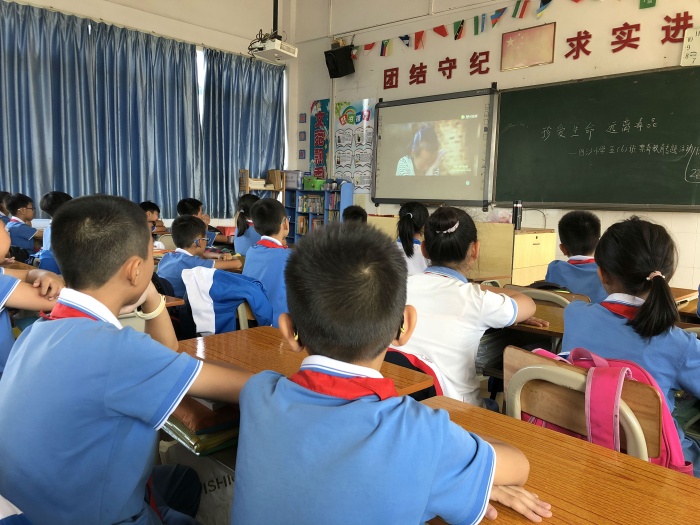 《希望》主要講述大涼山的孩子們因父母吸毒導(dǎo)致家庭破散而自立的故事。這個真實故事改編的影片吸引了高年級的同學(xué)們的注意,一個個看得認(rèn)真極了。隨后的專題教育片則為同學(xué)們明確什么是毒品、吸毒的危害,提出樹立正確的人生觀、養(yǎng)成良好的行為習(xí)慣等要求。觀影結(jié)束后,在班主任的組織下,同學(xué)們紛紛將自己對禁毒知識的理解和觀影體會在小組內(nèi)交流,他們紛紛表示這節(jié)課讓他們受益匪淺。