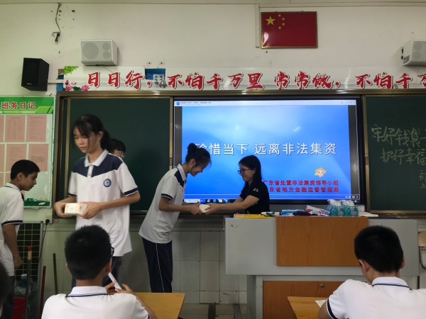 各年級(jí)響應(yīng)號(hào)召,積極開(kāi)展了以“拒絕高利誘惑、遠(yuǎn)離非法集資”主題班會(huì),各班以播放由廣東省處置非法集資領(lǐng)導(dǎo)小組、廣東省地方金融監(jiān)督管理局錄制的宣傳教育視頻——“珍惜當(dāng)下 遠(yuǎn)離非法集資”開(kāi)場(chǎng),旨在通過(guò)生動(dòng)形象的案例畫(huà)面讓學(xué)生初步建立對(duì)“非法集資”的認(rèn)識(shí)。同學(xué)們通過(guò)閱讀非法集資的宣傳單張,進(jìn)一步了解了如何辨別非法集資,如何避開(kāi)非法集資陷阱等知識(shí),同學(xué)們紛紛表示要堅(jiān)決抵制高額回報(bào)的誘惑,不貪小便宜,切實(shí)做到不接受各類(lèi)非法集資的傳單,不散布非法集資的信息。同時(shí),為了檢驗(yàn)此次活動(dòng)的宣傳效果,各班還開(kāi)展了“非法集資”有獎(jiǎng)問(wèn)答、“非法集資”即興演講等活動(dòng),充分調(diào)動(dòng)學(xué)生參與積極性。