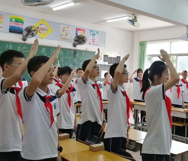 學校少工委總輔導員李勉霞老師給離隊隊員寄語:“今天,標志著你們兒童時代的結(jié)束,這是成長道路上的一個里程碑,是邁向青春的第一步,在此,我向初二級全體離隊隊員表示祝賀!”其次,由學校少工委主任盧新泉校長給離隊隊員致辭:“十四歲,這個陽光燦爛的季節(jié),是最有魄力的花季,青春一旦經(jīng)過努力,經(jīng)過奮斗,便會更加燦爛、輝煌。作為新時代的中學生,祖國、人民、老師、家長都對你們寄予厚望,期盼著你們成為祖國的棟梁之才,成為優(yōu)秀的接班人。而后,由學校少先隊大隊輔導員沈瑤老師帶領離隊隊員呼號:“準備著:為共產(chǎn)主義事業(yè)而奮斗”“時刻準備著”,鏗鏘有力的呼號聲在校園回蕩。