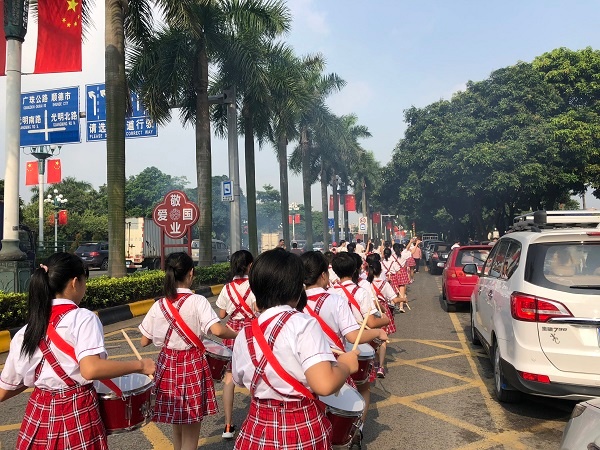 一人參軍,全家光榮。9月9日上午8點(diǎn),南頭鎮(zhèn)穗西和滘心村委辦公樓前門口聚集了村委會(huì)的領(lǐng)導(dǎo)、新兵的家屬、前來歡送的村民,熱鬧非凡。升輝小學(xué)的2支鼓號(hào)隊(duì)隊(duì)員們?cè)趨舞b添校長(zhǎng)、德育處黃永釗主任、大隊(duì)輔導(dǎo)員江婷婷老師的帶領(lǐng)下,排著整齊的隊(duì)伍站在村委大樓的門前歡送新兵入伍。
