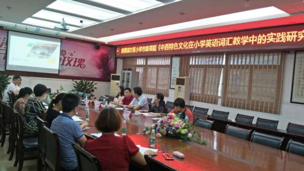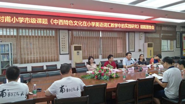 2019年6月27日上午,黃圃鎮(zhèn)對(duì)甫小學(xué)會(huì)議室里進(jìn)行著該校市級(jí)立項(xiàng)課題《中西特色文化在小學(xué)英語(yǔ)詞匯教學(xué)中的實(shí)踐研究》結(jié)題報(bào)告會(huì)。本次邀請(qǐng)了中山市教研室教研員張?zhí)﹦偫蠋?、中山市?shí)驗(yàn)小學(xué)陳玉河老師、南區(qū)竹秀園小學(xué)藍(lán)韶英老師和黃圃鎮(zhèn)教育事務(wù)指導(dǎo)中心袁港喜副主任前來(lái)參會(huì)。
