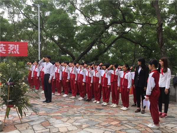之后,隊員代表梁培敏帶領(lǐng)全體隊員一起獻(xiàn)詞,表達(dá)了對先烈們深深的哀思。全體師生手捧鮮花,輕輕放在墓碑上,滿滿的哀思縈繞著……最后,隊員們圍在墓碑前瞻仰烈士墓芳名:羅若愚,石軍人,共產(chǎn)黨員,1945年孖沙事件犧牲;馮六女,通訊員,日寇掃蕩時犧牲……一位位英烈的芳名深深地刻在了隊員們的心上。