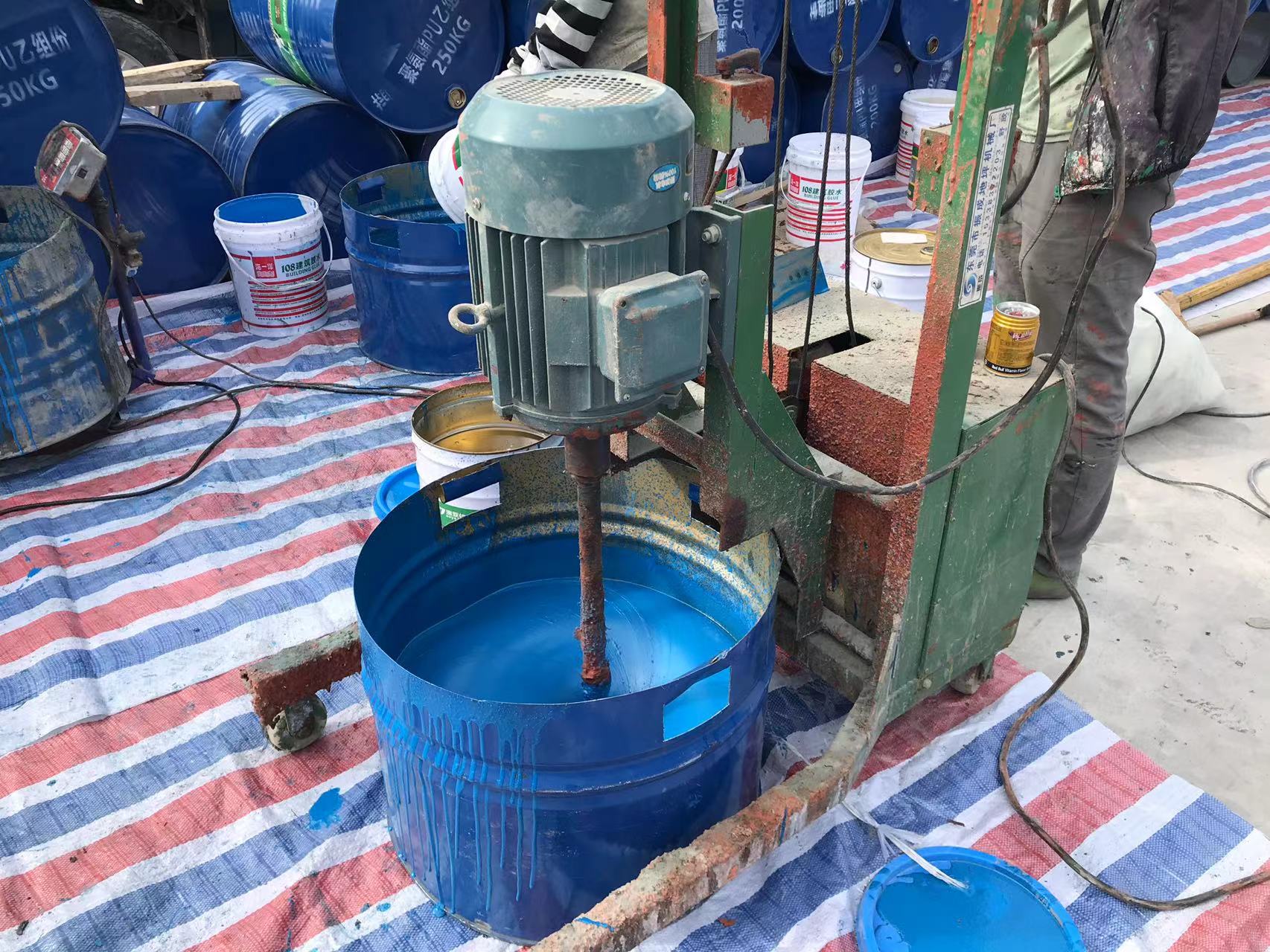 先稱取一定量的A組份于配料桶中,按照1:5的比例加入B組份,用電動攪拌機(jī)攪拌均勻后,再加入計(jì)量的黑膠粒并攪拌均勻,最后加入計(jì)量的催化劑并攪拌均勻即可施工。