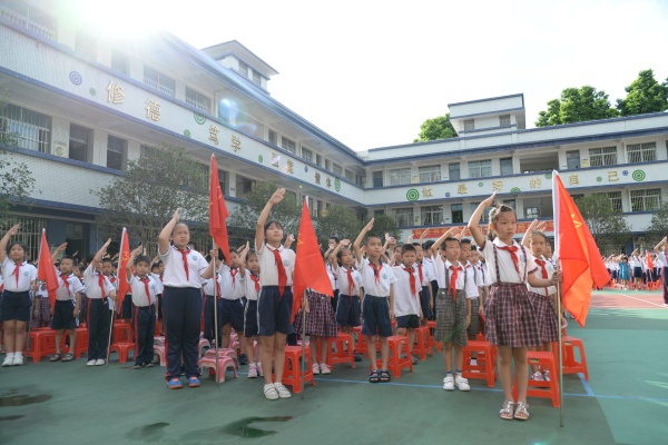 最后,在大隊(duì)輔導(dǎo)員周銳鵬老師的帶領(lǐng)下,全體隊(duì)員起立行隊(duì)禮,退隊(duì)旗!