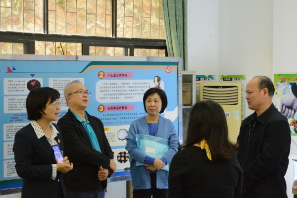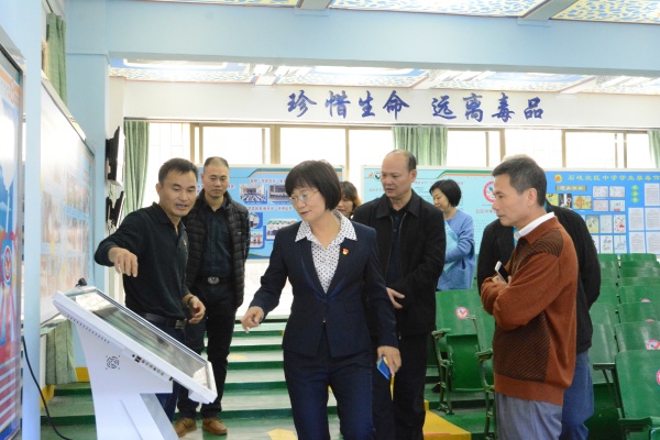 在趙翠顏校長的帶領(lǐng)下,考察團(tuán)各位領(lǐng)導(dǎo)饒有興致地參觀了禁毒基地。在毒品標(biāo)本柜前,領(lǐng)導(dǎo)們駐足觀看,各式各樣的新型毒品模型,引起他們的深思和驚嘆;在禁毒展板前,禁毒感言、禁毒LOGO設(shè)計(jì)、禁毒漫畫、禁毒歌謠、禁毒誓詞和禁毒微劇本等,充分調(diào)動(dòng)家長和師生參與禁毒活動(dòng)的積極性,開啟“禁毒在體驗(yàn)、禁毒在參與、禁毒在創(chuàng)作”的教育之路;在多媒體互動(dòng)區(qū)域,禁毒網(wǎng)絡(luò)游戲闖關(guān)、吸毒后人臉變化系統(tǒng)吸引了不少來賓的注意,他們實(shí)地體驗(yàn),認(rèn)為充滿趣味的互動(dòng)讓毒品預(yù)防教育及普及青少年法治知識變得更加容易。