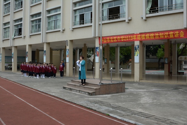 按照《廣東省教育廳關(guān)于做好2019年世界防治結(jié)核病日宣傳教育工作的通知》要求,4月1日早上,北區(qū)中學(xué)師生集中在學(xué)校運(yùn)動(dòng)場(chǎng),在升旗儀式后,趙翠顏校長(zhǎng)先是對(duì)全體同學(xué)進(jìn)行結(jié)核病防治教育。2019年的“世界防治結(jié)核病日”活動(dòng)主題是“開(kāi)展終結(jié)核行動(dòng),共建共享健康中國(guó)”。趙校長(zhǎng)根據(jù)《學(xué)校結(jié)核病防控工作規(guī)范(要求)》,向師生們宣傳結(jié)核病的防治知識(shí)。