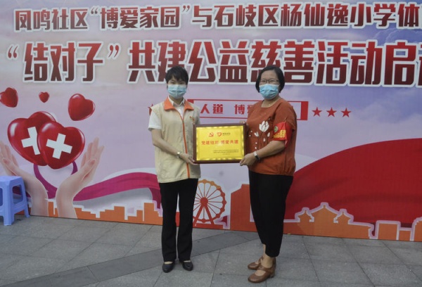隨后,鳳鳴社區(qū)黨委向楊仙逸小學(xué)體育路學(xué)校黨支部贈送“黨建結(jié)對,博愛共建”紀(jì)念牌匾,參與活動的領(lǐng)導(dǎo)嘉賓向各班級班主任頒發(fā)“結(jié)對子”關(guān)愛牌。全體人員合影留念,正式為本次公益慈善活動按下“啟動”鍵。