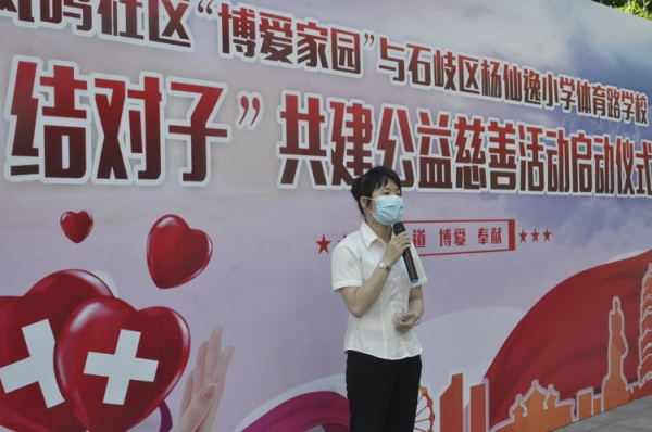 接著體育路學(xué)校家長代表吳淑玲女士作了熱情洋溢地發(fā)言,她表示對學(xué)校與鳳鳴社區(qū)“結(jié)對子”共建公益慈善活動表示十分支持和認(rèn)同,認(rèn)為此項(xiàng)活動對孩子們來說不僅是一項(xiàng)公益慈善活動,更是一次非常難得的社會實(shí)踐,能夠幫助別人、服務(wù)社會,非常有意義!她倡議更多的家長身體力行地帶領(lǐng)孩子一起參與“結(jié)對子”慈善活動,同時(shí)祝愿此次活動讓孩子們都能學(xué)有所思、學(xué)有所長!