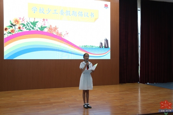 典禮的第三部分,由學(xué)校少先隊(duì)大隊(duì)委發(fā)出假期倡議書,倡議同學(xué)們?cè)诩倨谥?,積極參加垃圾分類,小手拉大手,親子共讀及研學(xué)等一系列活動(dòng)。書是人類進(jìn)步的階梯,她倡議同學(xué)們明禮守法、強(qiáng)身健體、品讀經(jīng)典。大隊(duì)部的倡議與法制安全講座相輔相成,同學(xué)們也更加明確了如何度過一個(gè)充實(shí)而有意義的暑假。