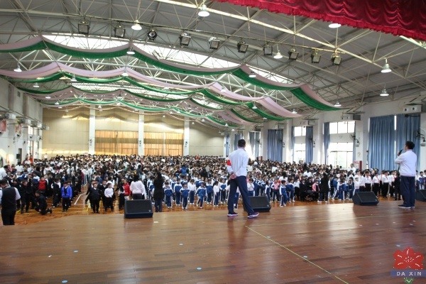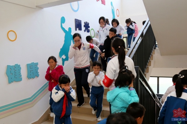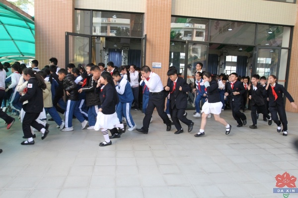 為了模擬真實的火災場景,全校師生于下午2:45分齊聚校體育館觀看一部勵志電影《奔跑的少年》。電影的內容很貼近孩子們的現(xiàn)實生活,孩子們也正好需要這樣的勵志教育,再加上故事情節(jié)曲折離奇、趣味無窮,所有的師生完全沉浸在電影中,完全和電影融為了一體。正在這個時候應急警報突然響起,全場一陣騷動,但很快就平息了下來;緊接著靠近幾個出口的班級在老師的指揮下,用手掩住了口鼻,低著頭,弓著腰迅速地向校操場疏散開去。離通道較遠的,緊跟著人流也迅速向操場移去。全校師生兩千多人,一個一個掩鼻、捂嘴警覺無比,耳邊只有刺耳的警報聲,前面只有快速移動的人群,沒有一個人往后看,這真是一個奇跡!人群到達操場后自行分班級按照平時的集會隊列整齊有序地排好。當最后一個班級到達操場時,記時員向負責演練的總負責人崔士強主任報告:總共用時4分32秒。