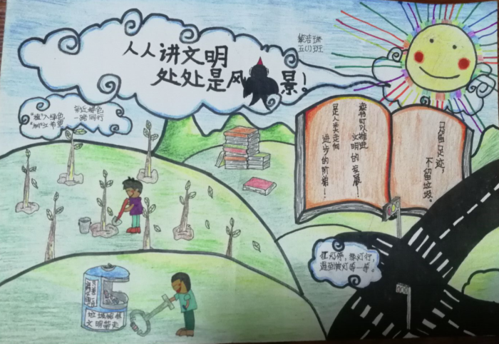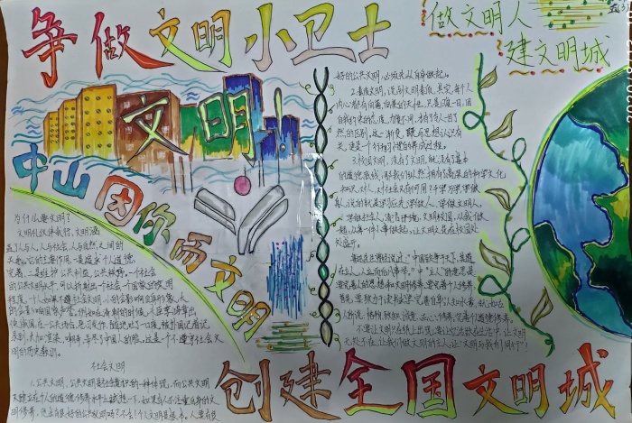 為深入踐行社會主義核心價值觀,為了讓創(chuàng)文宣傳活動更深入地開展,切實貫徹執(zhí)行中山市創(chuàng)建全國文明城市文件精神,開發(fā)區(qū)第三小學少先隊組織開展創(chuàng)文主題繪畫活動。以比賽為契機,以孩子帶動家人,齊齊參與到創(chuàng)文活動中來。隊員們利用暑假在家休息的時間,圍繞活動主題,發(fā)揮想象,廣泛搜集資料,認真設計版面,創(chuàng)造出了一幅幅內容豐富、形式多樣的繪畫和手抄報作品。隊員們以豐富的想象力詮釋了自己對“創(chuàng)文”的理解,用手中的彩筆盡情描畫了自己對創(chuàng)建文明城市的熱情。