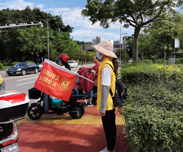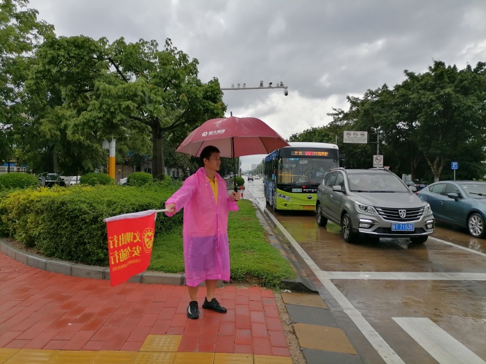 勸導文明出行,幸福安全你我他。孫文東路麗港城與尚城處紅綠燈處車流量大,人口密集。三小的交通勸導小組的教師志愿者每天在此配合交警部門對亂闖紅燈、車窗拋物、違規(guī)駕駛等不文明行為進行文明勸導。夏天天氣多變,他們穿著志愿者馬甲,手拿“文明勸導”旗幟,有時頂著烈日,有時被淋成落湯雞,從不缺崗。此外,交通勸導小組每天還安排10名教師志愿者深入濠頭大街開展文明城市勸導活動,引導社區(qū)車輛規(guī)范停放并向來往行人和車輛宣講道路安全知識,提醒文明規(guī)范停車的重要性,邀請他們一起為創(chuàng)建文明城市貢獻一份力量,共同營造有序文明環(huán)境。天氣炎熱,不少老師嗓子冒煙,多喝水又擔心上廁所問題難解決,只能在中午休息時才大量補水,不少出現(xiàn)了惡心反胃的感覺。但是他們毫無怨言,休息一天后再次申請上崗。