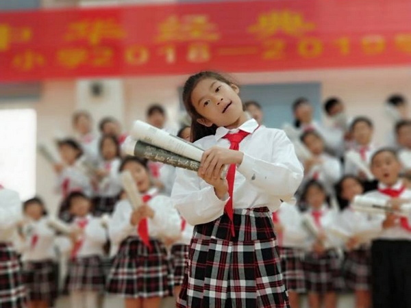 四年級(jí)的《千字文》和五年級(jí)《論語(yǔ)》同樣精彩。有誦讀,有吟唱,有配樂(lè)表演,有動(dòng)作演繹,還有書法表演穿插其中。特別值得一提的是四6班的孩子們,全文倒背如流,看得其他班的同學(xué)不由得豎起了大拇指。同學(xué)們?cè)谡b讀表演和觀看欣賞中,感悟了中華文化的源遠(yuǎn)流長(zhǎng),體會(huì)了華夏經(jīng)典的博大精深,感悟著語(yǔ)言文字的魅力,拓展了古今視野,提高了自身的修養(yǎng)。